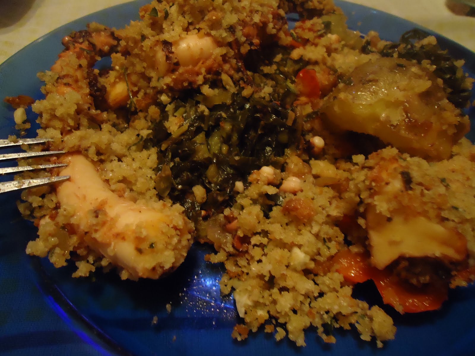 espalhe o caldo verde e as batatas cozidas no fundo do tabuleiro(aqui polvilhei com alho em pó e reguei com um fio de azeite) e coloque por cima a mistura do polvo.esfarele a broa e junte o restante azeite,misture,deite por cima do polvo e leve ao forno até ficar douradinho.