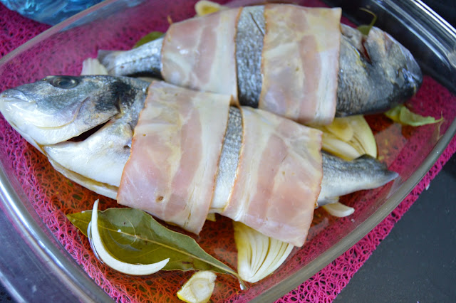 Num tabuleiro de ir ao forno colocar  a cebola em meias luas, os alhos laminados, as folhas de louro,  umas pedras de sal e colocar as douradas em cima previamente enroladas em fatias de bacon (se quiser pode também colocar uma fatia na barriga da dourada).