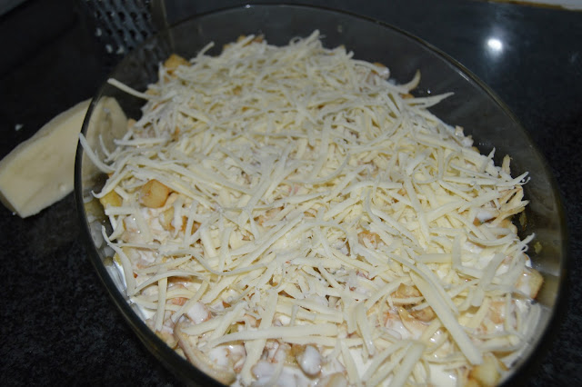 Numa frigideira fazer um refogado com um fio de azeite, a cebola,a salsa e o alho picados, assim que a cebola ficar translúcida adicionar o frango desfiado e deixar refogar mais um pouco. Num tabuleiro de ir ao forno misturar as batatas fritas e o preparado de frango, regar com molho bechamel e polvilhar com o queijo ralado.