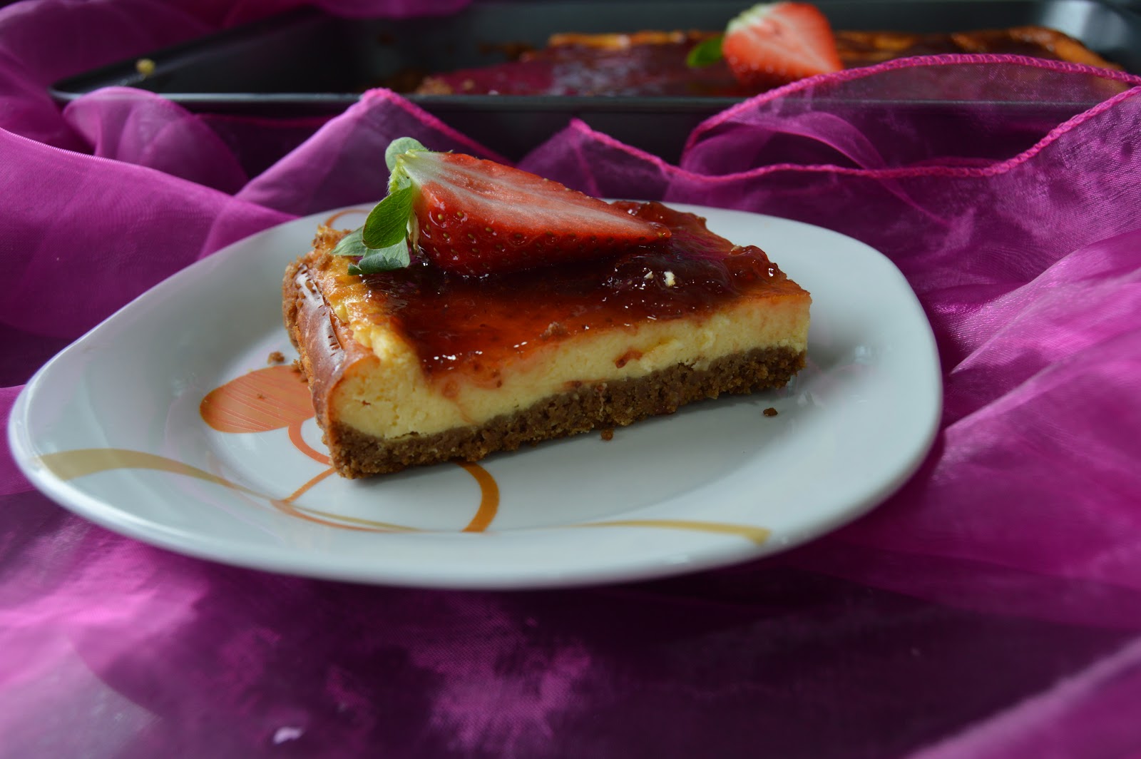 Comece por trituras as bolachas, o açúcar e acrescente a manteiga. de seguida forrar uma bandeja retangular que possa ir ao forno com o preparado e reservar no frigorífico.
